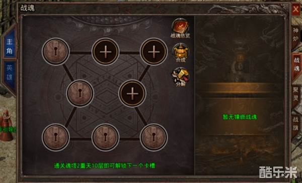 玩法介绍:装备战魂获得大量属性,使用战魂羽翼、复合精华可合成更高级战魂,不需要时前往分解,升级后的战魂可百分之百返还升级材料。