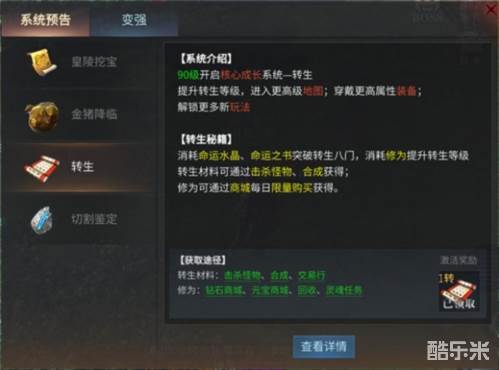 (2)90阶段当我们通过练功房或者打怪升到90级时将会正式开启我们的转生系统,转生需要消耗转生材料,分别为命运水晶与命运之书。