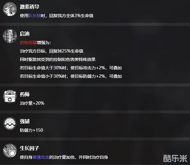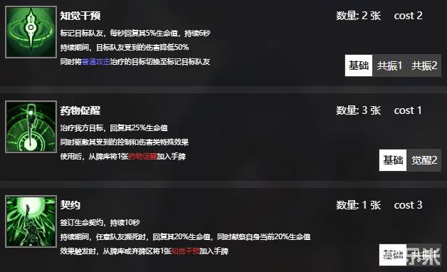 每隔10秒触发1次,被知觉干预标记的目标队友受到攻击时,从牌库或弃牌区将1张药物促醒加入手牌