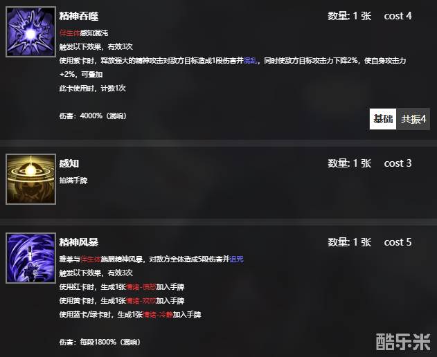 使用紫卡时,获得10点精力值,释放强大的精神攻击对敌方目标造成1段伤害并混乱,同时使敌方目标攻击力下降2%,使自身攻击力+2%,可叠加
