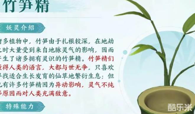 竹笋精是竹笋幻化而成的喜欢水会被雷属性克制,由于诸多植物中竹笋扎根较深,所以在地劫的时候受到了灵气影响,产生了拥有很多拥有灵识的竹笋精,它们能听懂人类语言,但大多与世无争只想找一个适合生长的地方繁衍生息,当然也会有小部分竹笋精对人类抱有敌意,它们的特殊能力是化身钻头持续击退敌人。