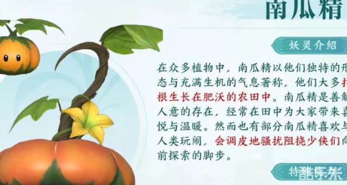 南瓜精是南瓜幻化的同样喜欢水被雷克制,它们大多生长在肥沃的农田里面,是非常善解人意的存在,会带给人们喜欢和温暖,不过也有一些南瓜精喜欢和人类玩闹,会调皮的阻挡各位玩家探索的脚步,它们的能力是轰炸,轰炸后产生的南瓜瓤还会让敌人行动迟缓。