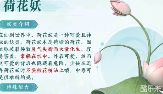 荷花妖是荷花幻化而成的,它们是一种可爱且神秘的妖灵,非常容易害羞平常都会躲藏在水中,它的能力是喷洒花粉,让敌人进入中毒状态,所以玩家们在逗弄荷花妖的时候,千万要小心不要被花粉沾上,中毒是很难解的。