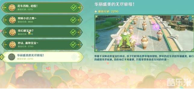 《原神》花车摇曳第5天华丽盛美的无尽旅程属于不断循环的关卡,玩家只需持续收集花朵就能获得高分,并且还能随时提前结算,下面和酷乐米小编一起来看看吧