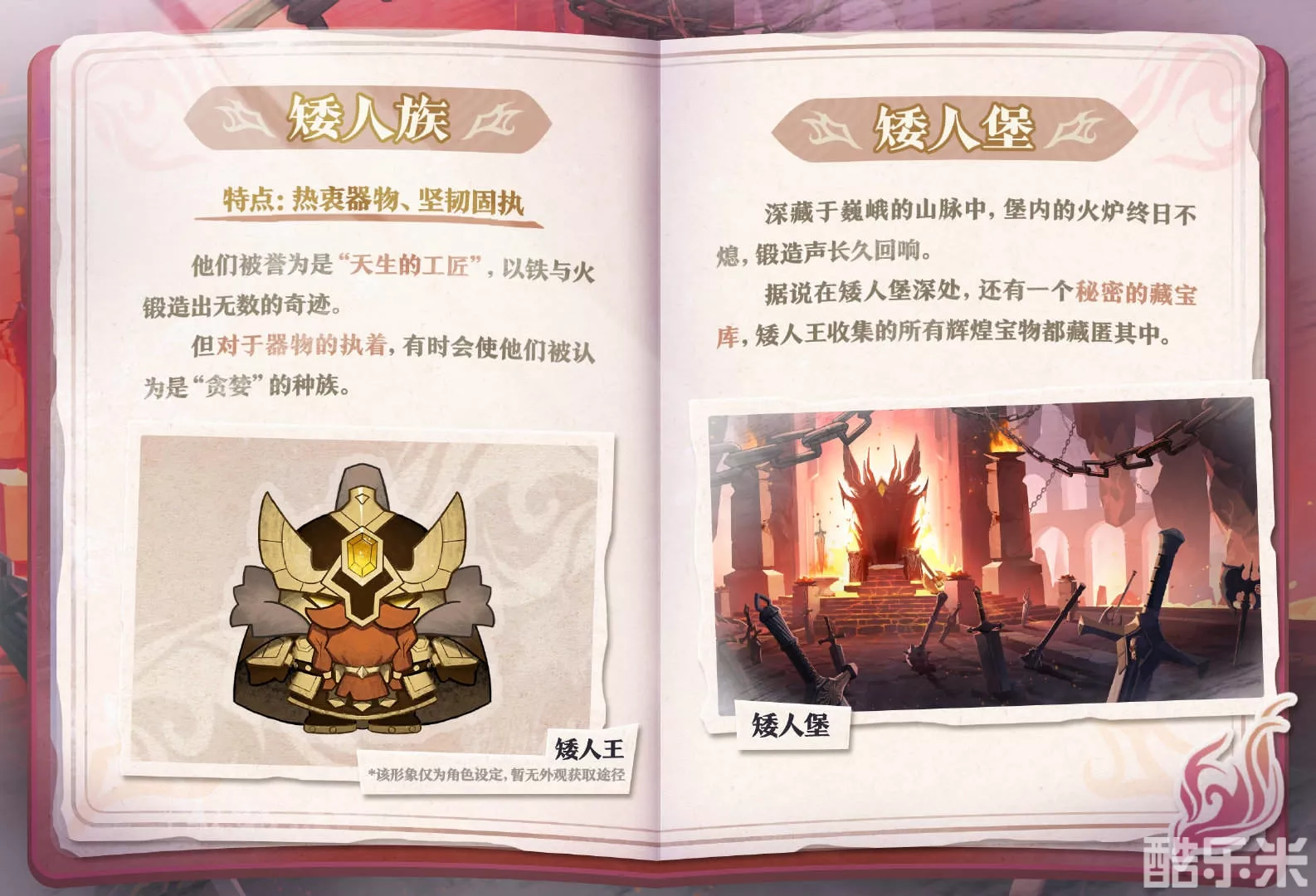 热衷器物、坚韧固执的矮人族,他们被誉为是“天生的工匠”,以铁与火锻造出无数的奇迹。他们的居所矮人堡深藏于巍峨的山脉中,堡内的火炉终日不熄,锻造声长久回响。