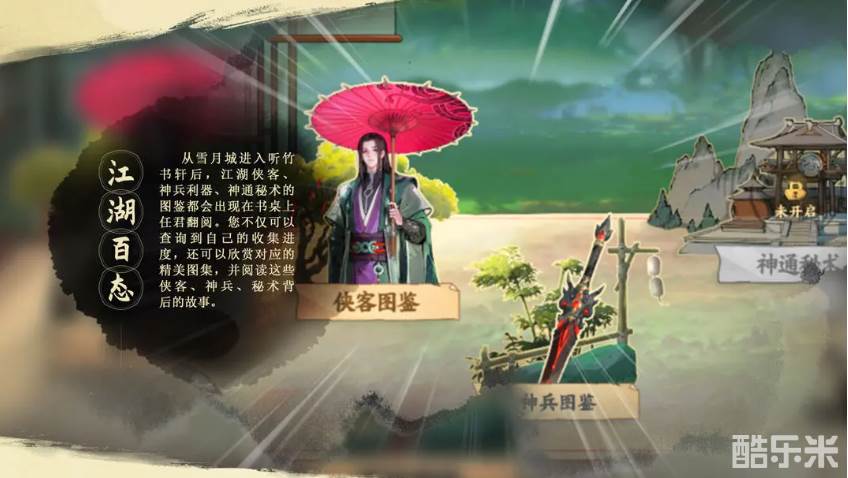 从雪月城进入听竹书轩后,江湖侠客、神兵利器、神通秘术的图鉴都会出现在书桌上任君翻阅。您不仅可以查询到自己的收集进度,还可以欣赏对应的精美图集,并阅读这些侠客、神兵、秘术背后的故事。