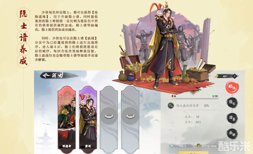 少侠每次拜访隐士,都可以获得【沧海遗珠】,用于升级隐士谱。同时您收集到的隐士将按照一定比例为您队伍中所有的侠客提供属性加成,隐士谱等级越高,隐士提供的加成也越高。