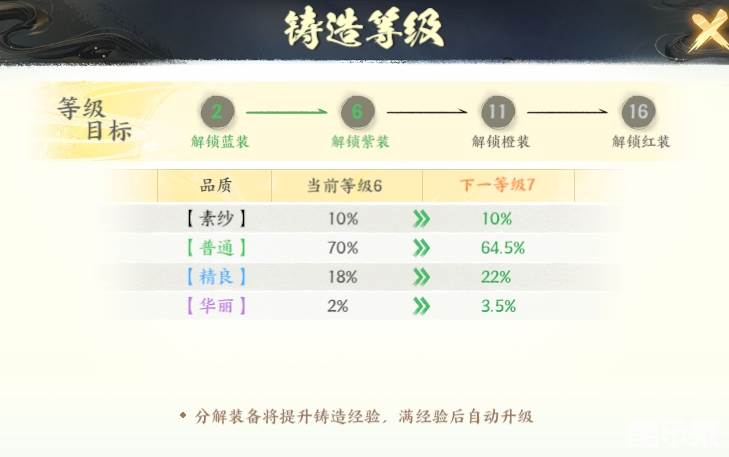 所以少侠们一定一定要记得分解装备提高铸造等级后再继续进行铸造哦!