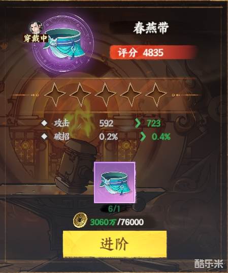 在进阶界面选中需要进行升级的装备,消耗同等级装备及一定铜币即可进行强化