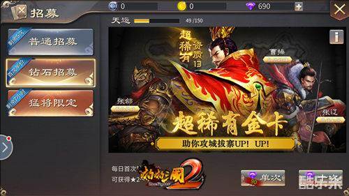 随着主公在三国乱世中闯荡,“武将招募”就开启了收服名将的大门。招募中,共有 “普通招募”、“钻石招募”以及“猛将限定”,主公们可通过普通招募免费招募武将,也可通过钻石招募获得珍贵的4星名将。不过,最吸引人的还是限时开启的猛将限定。各种超稀有名将,等待主公们的召唤!值得一提的是,当天运值达到一定数值时,主公将百分百获得4星名将哟!