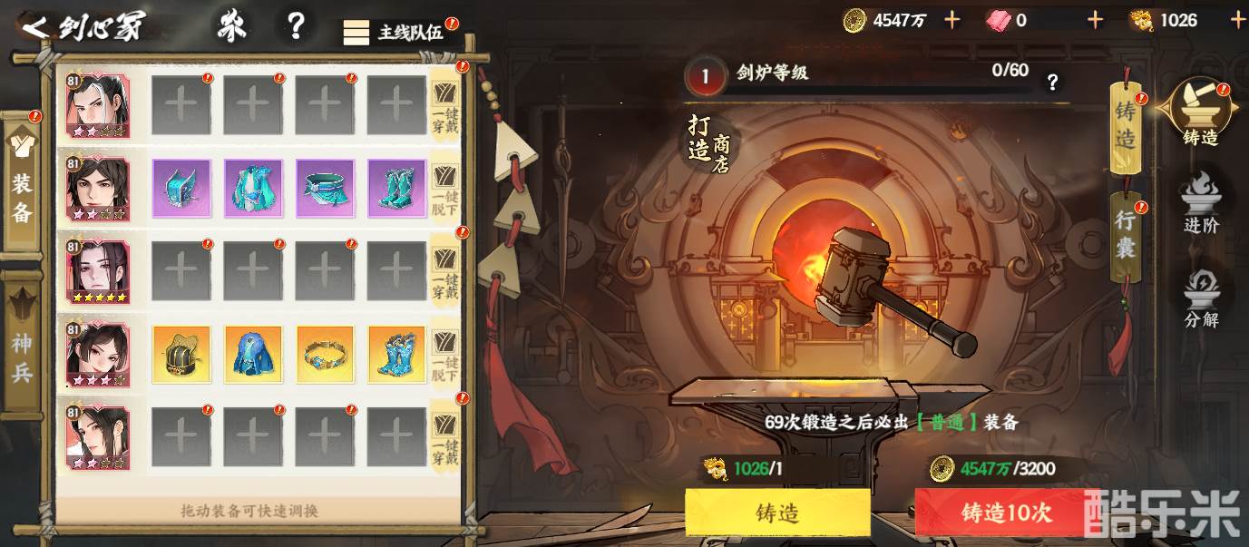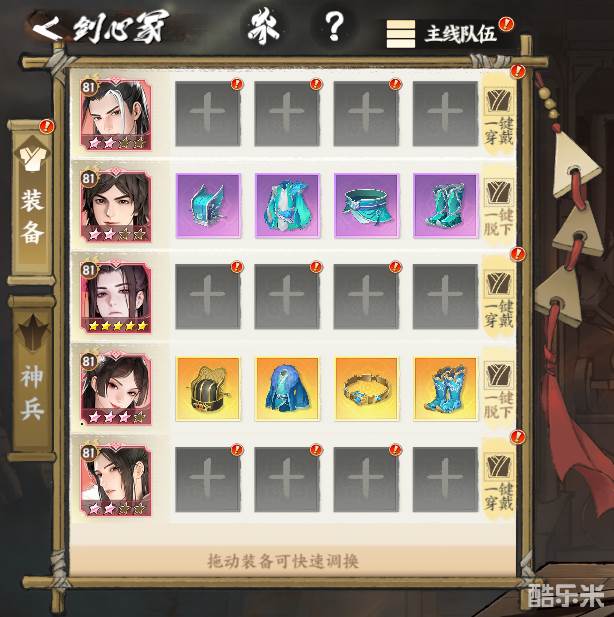 少侠进入剑心冢后,可查看到当前主线队伍的装备界面以及剑炉铸造界面。剑心冢界面左侧展示的是当前主线队伍的侠客阵容,并在每个侠客头像的后面展示该侠客当前穿戴的装备。下面和酷乐米小编一起来看看吧