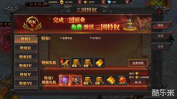 1、玩家上线就送VIP5,5倍攻速,点击三国特权就能领取VIP礼包。