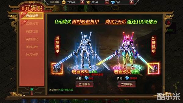 6、使用钻石就能购买炫酷机甲,还有100%钻石返利,让你0元就能获取。