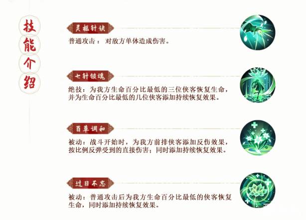 除此之外,她还能在战斗开始时为前排侠客添加持续恢复和反伤效果,反弹受到的直接伤害。