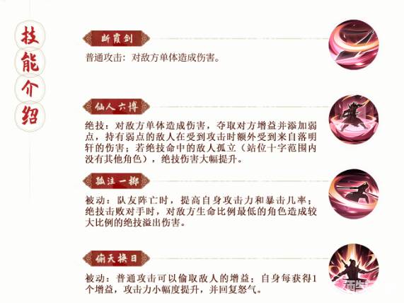 在队友阵亡时,落明轩会提高自身攻击力和暴击几率;用绝技击败对手时,还会对敌方生命比例最低的角色造成伤害。