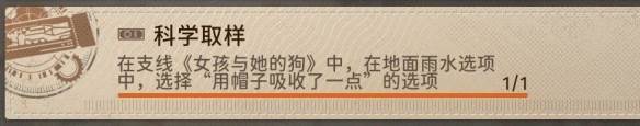 解锁条件:在“女孩与她的狗”第三幕,与地面左侧的水坑互动并选择“用帽子吸取部分水样”。