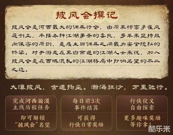 披风会是河西最大的佣兵行会,由原黑榜高手雀风庭创立,承接各种江湖事务的委托,多年来坚持双向保密的原则,是雇主与佣兵之间最为安全隐秘的桥梁。对于游走在黑白两道的江湖人士来说,加入披风会是在西域混乱的江湖格局中打响名望的不二之选。