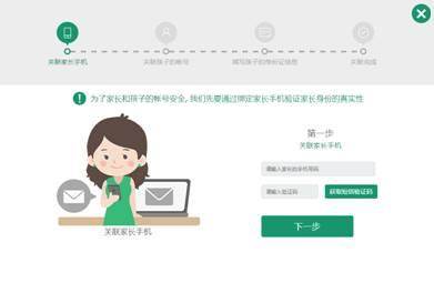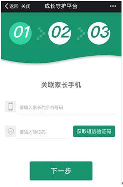 第三步:验证并关联家长手机。输入家长手机号获取验证短信,然后输入短信验证码。验证成功后点击“下一步”。