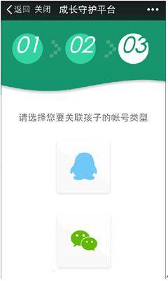 第四步:选择关联的孩子账号类型。这里需要提醒家长的是,您需要确认您的孩子在游戏中使用QQ还是微信帐号进行游戏,在此,我们建议家长考虑将孩子的QQ和微信帐号都做绑定。