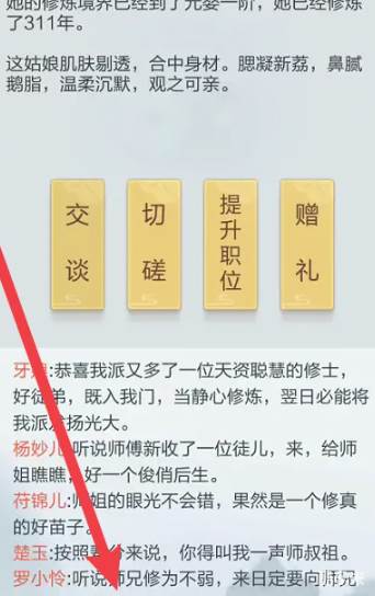 选择一个门派成员,进入详细页面后点击交谈功能即可