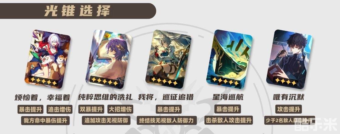 其他光锥可考虑:「纯粹思维的洗礼」,「最后的赢家」还不错但对暴击率有所要求等光锥