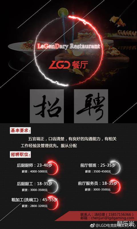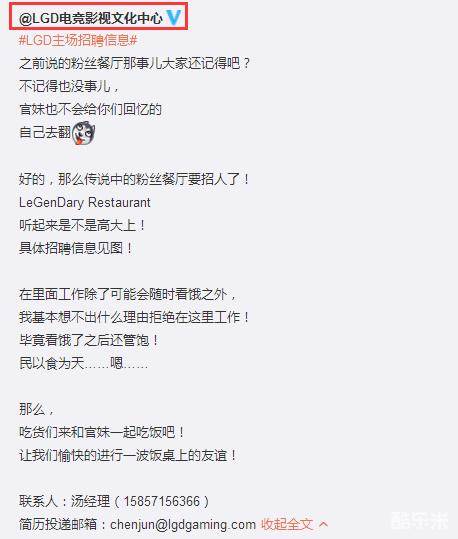 既然是电竞影视文化中心那配置一定得全呀,所以LGD还筹备了粉丝餐厅,今天上午也发布了餐厅的招聘信息。