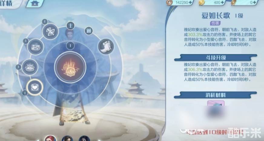 三技能“爱如长歌”则是一个清怪很快的技能,虽然一段伤害只有303.3%攻击力的加成,但在命中敌人后会让场上的其他应付转化为小爱心四散飞去,每一枚小爱心都有着该技能50%的伤害,用于收割散落在场地各处的残血小怪会非常有效率,并且这招的冷却时间算是雅妃所有技能中最短的了,因此后期冷却上去以后可以高频率的使用。