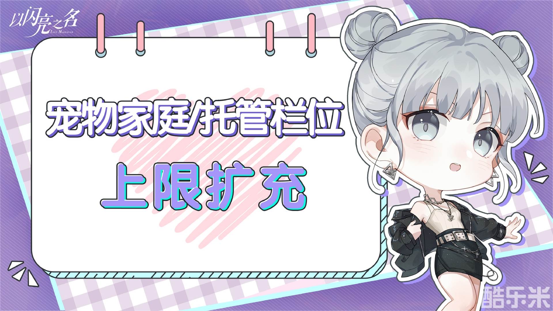 以闪亮之名宠物栏位上线扩充多少个?以闪亮之名的宠物家庭、托管栏位上限要扩充啦,这次的新功能在新的卡池版本中就要实装啦,下面酷乐米小编为大家带来的具体内容,感兴趣的玩家们千万不要错过哦!