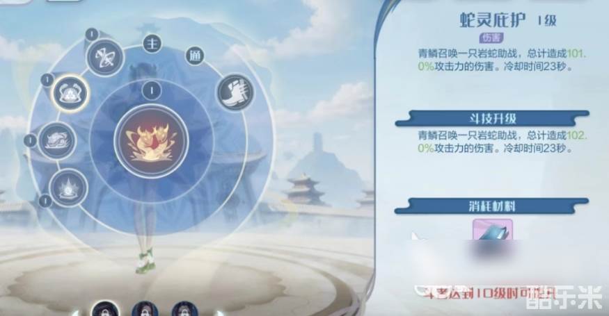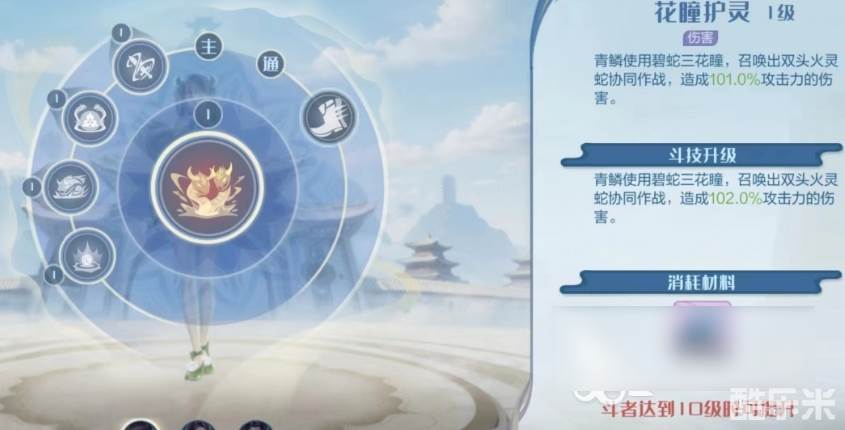 最后青鳞的大招“花瞳护灵”也很不错,使用后会召唤出一头双头火灵蛇来助阵,它的攻击伤害和一技能的岩蛇一样也是102%,不过其他方面的属性会更强,尤其适合帮助青鳞吸收伤害。