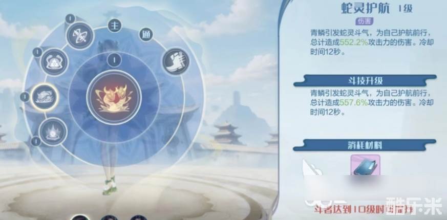 二技能“蛇灵护航”也是青鳞的一大强力技能,这招使用后会召唤蛇灵斗气为自己护航前行,表现在实战中就是青鳞位移一段距离,然后途中碰到的敌人都会被伤害一遍,如果吃满的话,会有552.2%攻击力的伤害,并且这招冷却时间也不长,只有12秒,由于它的前行也会消耗一段时间,所以二技能的实际使用间隔要比冷却时间看上去更短。