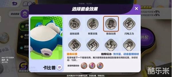 7、推荐徽章:替身玩偶,可以使宝可梦在顽皮雷弹预告落点中留下玩偶替身,被敌方牵制,距离落点过远时,可以快速回到落点位置。