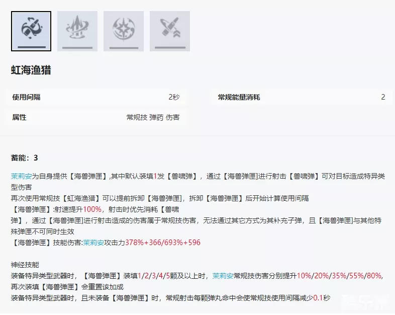 单独使用常规技只能装填1发海兽弹药,效果不算好,吃不满加成。而在有特殊弹匣时使用常规技会直接清空,输出时不要误触。记得千万不要在装了特殊弹匣的情况下让她下场,会出问题的!