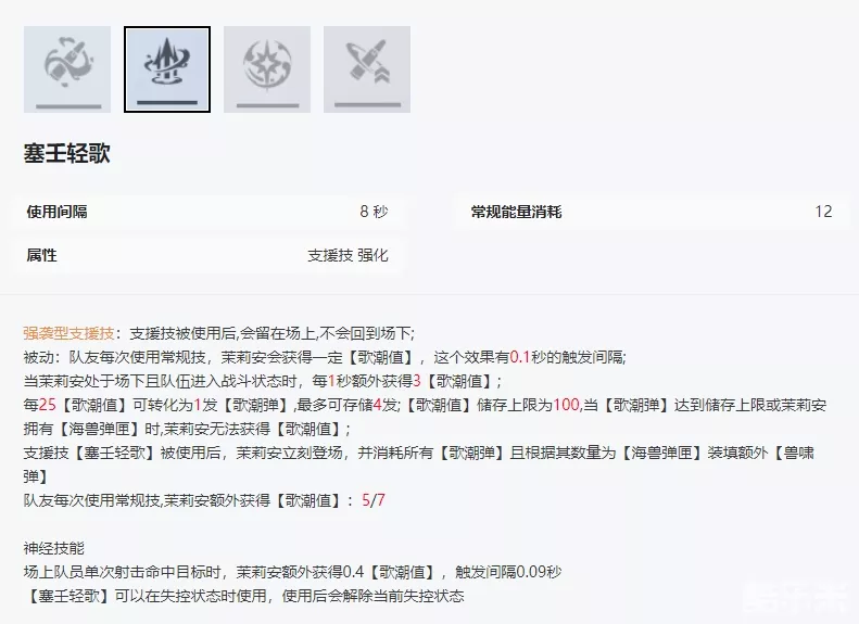充能的主要方式就是连续使用常规技,因此需要配合高频率使用常规技的队友如薇蒂娅-龙舌兰和凯茜娅-朝翼。神经技能可以增加一些平射回复的能量,不过不是最主要的来源。
