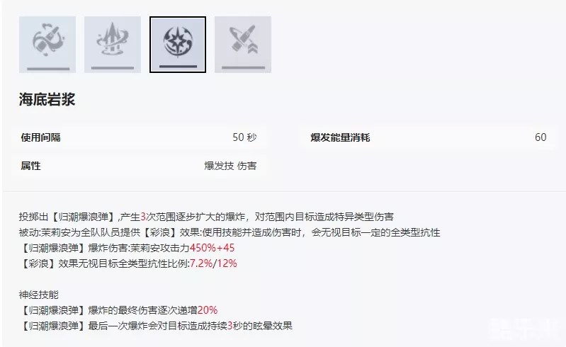 投掷奇妙形状的的手雷造成伤害。耗能60不算低,而且她的技能加成主要是常规技,大招重要性就比较低。新手缺资源可以先不点神经技能。