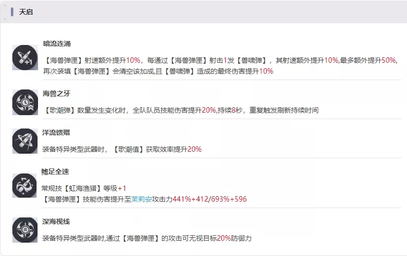 1天启能够提升爆发阶段的射速,加快循环。2天启可以在后排给前场提供更多的技伤加成。1 2天启都挺不错,建议有能力可以刷到2天启。