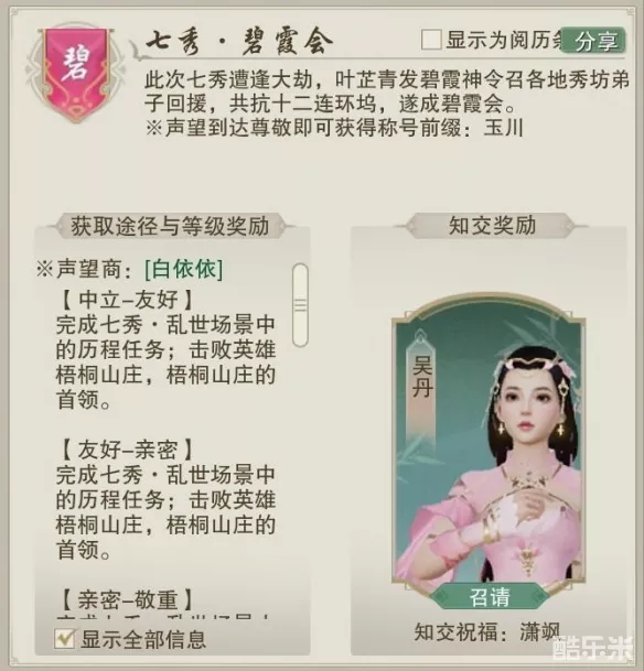 七秀碧霞会声望到达尊敬即可获得称号前缀【玉川】,很多玩家都想知道剑网3七秀碧霞会声望怎么提升,完成七秀·乱世的地图任务、击败梧桐山庄的首领即可提升声望,下面和酷乐米小编一起来看看吧