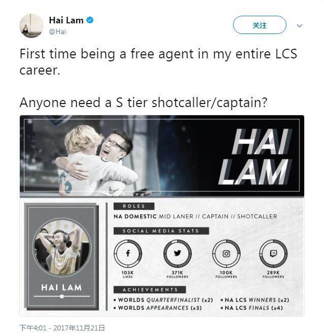 就在刚刚,北美LCS知名选手Hai通过推特表示自己已经成为了自由人: