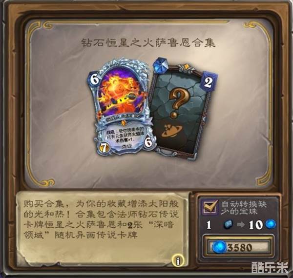 合集包含法师钻石传说卡牌恒星之火萨鲁恩和2张“深暗领域”随机异画传说卡牌。
