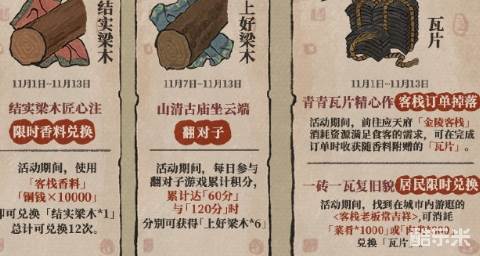 活动期间,使用客栈香料、铜钱x10000即可兑换结实梁木x1,总计可兑换12次。