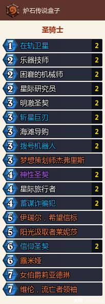 这套卡组是我们熟悉的德莱尼圣契骑。当前版本下圣契骑的减费仅有两张,斩星巨刃和星际旅行者,而由于减费体系对于圣契骑实在过于重要,因此带上乐器技师和困窘的机械师进行检索。阳光汲取者莱妮莎非常契合减到0费的圣契,同时也能搭配神性圣契一回合斩杀对手,因此舍弃了上个版本荧光棒体系。露米娅是新版本非常强力的一张抗快神器,而维伦可以重复德莱尼的战吼和亡语意味着可能产生更多的圣契减费,打出更高的对局上限。对局留牌方面,全力找圣契减费和定向检索圣契/圣契减费。拨号机器人作为卡组为数不多的过牌可以做到伪定向检索的效果,而在轨卫星发现德莱尼的效果无非是博一个上限,也可以换成221圣盾过牌。