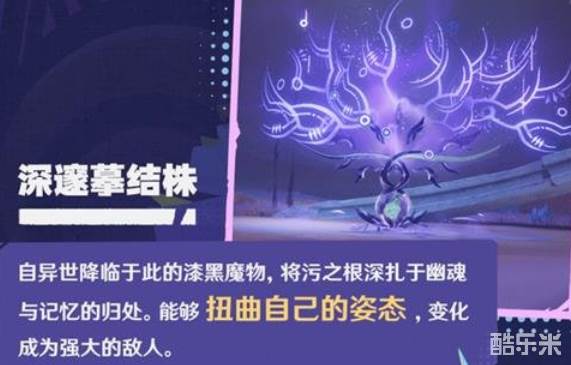 深邃摹结株是来自深邃晦暗的异界,侵蚀大地中记忆的漆黑魔兽。能够扭曲自己的姿态,变化成强大的敌人。其部分攻击会施加可叠加的「蚀破」状态,会在一定时间后,使队伍中自己的当前场上角色损失生命值。战斗中,深邃摹结株会进行「晦暗祝祷」,为自己赋予虚界力护罩。如在此时利用元素攻击到一定次数破坏护罩,即可使其陷入混乱,具有夜魂性质的元素攻击会更有效率地突破其防御。