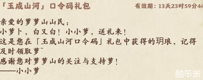 领取方式:在游戏内点击[ 头像]- [设置]- [政策]-[兑换码]输入口令码兑换礼包。