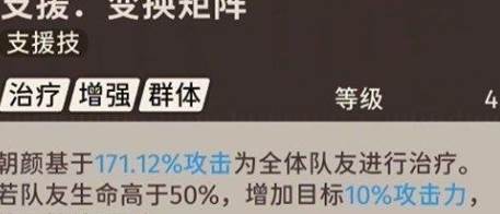 全体回血,以及增加攻击力,如果血量低,就是加双防,因为现在的自动逻辑,朝颜的自动战斗并不好用,更适合放在支援位。