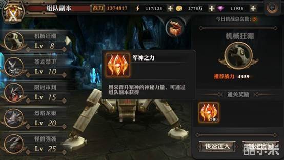 玩家通关普通副本2-3后即可开启组队副本玩法,通关组队副本可以获得大量的军神之力(用于升级军神)。