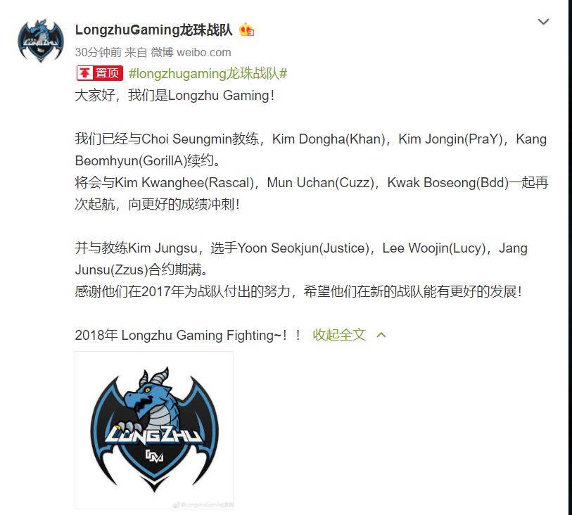 龙珠战队于零点左右在微博和脸书同时发布消息,称战队已经与Khan、Pray以及Gorilla续约。2018年,又是一样的龙珠了,原班人马再战一年。