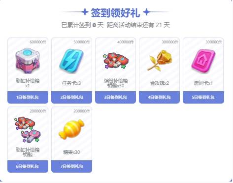 6、累计签到6天:彩虹补给箱钥匙×30+缤纷补给箱钥匙×30
