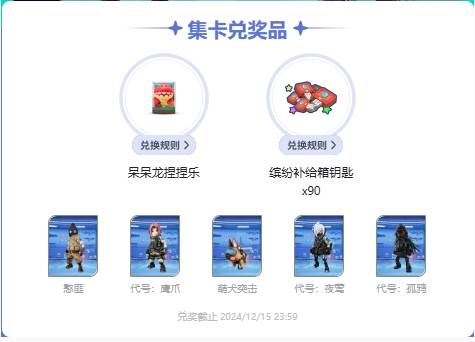 3、收集齐卡牌组合【憨匪、代号:鹰爪、萌犬突击、代号:夜莺】可以兑换奖励【缤纷补给箱钥匙x90】,共30000份。