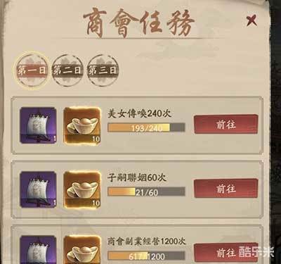 掌柜们可以消耗元宝,对商船进行升级,商船升级后会改变商船外观,提高利润率获得更高收益。每日将解锁不同的商会任务,商会任务由商会成员共同完成,完成任务后所有成员均可获得相应奖励。