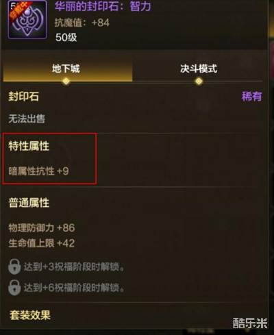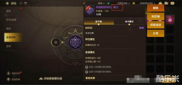 先来说下封印石,封印石最上方的这个名称(例如智力),我们完全不用管它,其实它的作用就是和其他两个精髓,只要有两个是一样的,就能凑齐两件套效果,所以我们保证两个精髓是一样的就行了。