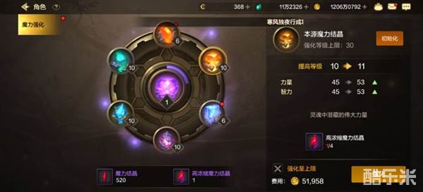 1、魔力强化。在魔力强化界面里,力智项和暴击项点满三十级后,剩下四项平均点到十五级,会激活中间的超凡魔力结晶的等级,会提升大量抗魔值。